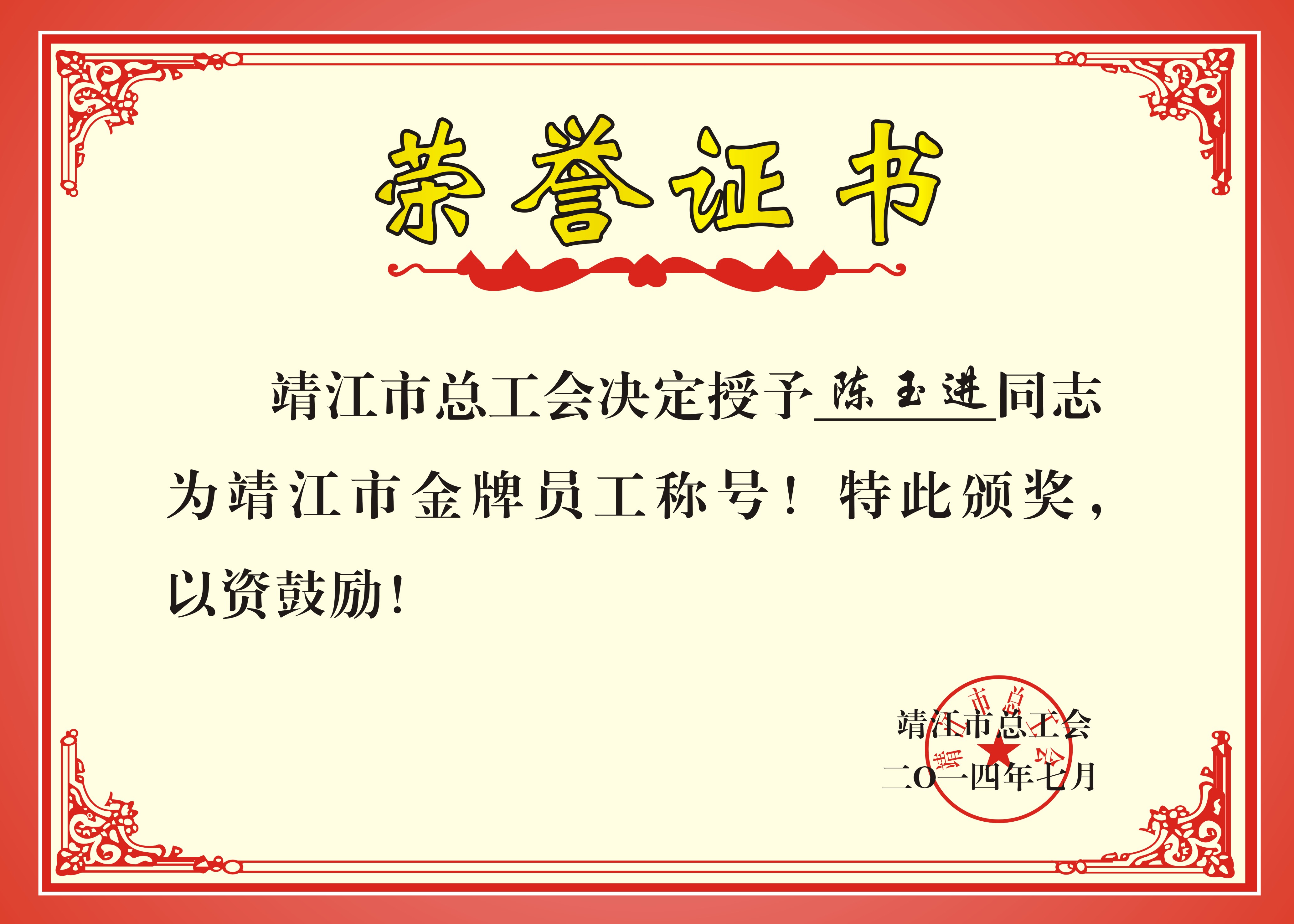 陳玉進同志在衡器行業(yè)從事18年,2001年進入江蘇長江衡器有限公司,進入公司后,對地磅安裝調(diào)試等技術(shù)的自學(xué)與鉆研,在2014年7月由靖江市總工會舉行的技能大賽上奪冠,獲得“靖江金牌員工”稱號。